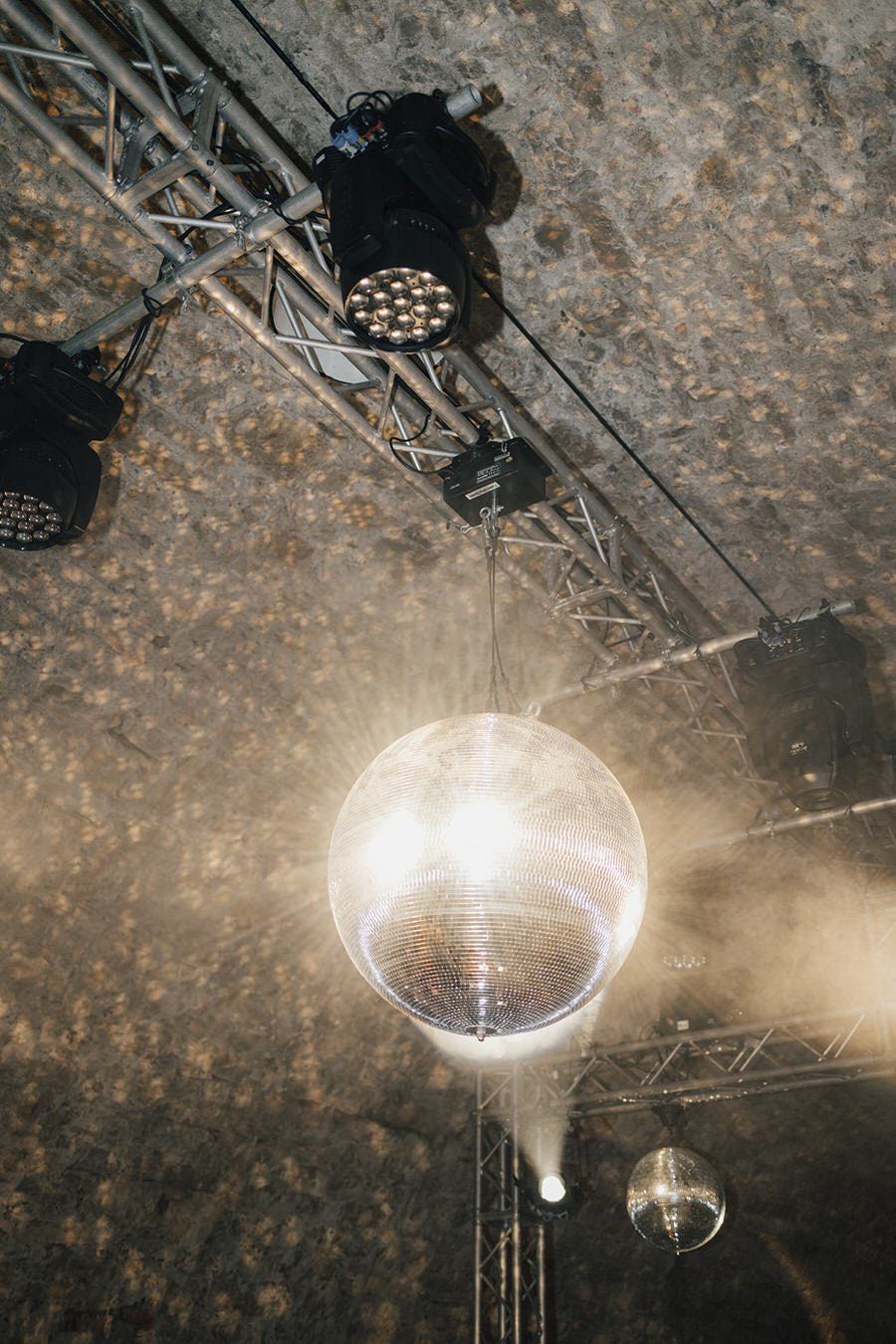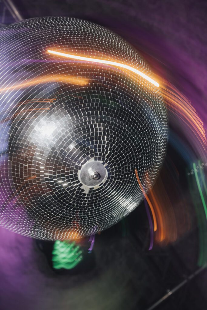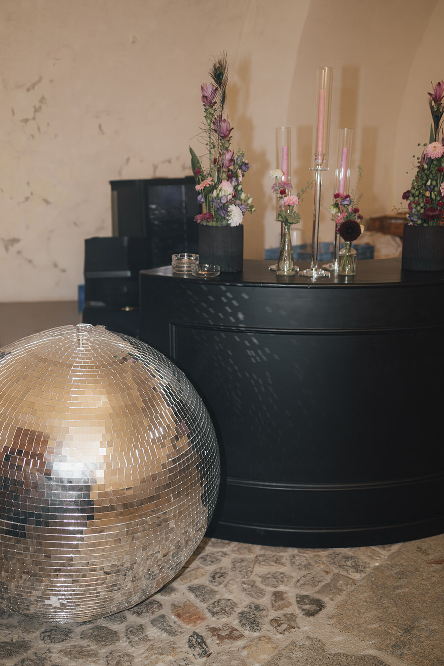 Als zusätzliches Eyecatcher-Element setzten wir XXL-Disco-Kugeln ein, die wir vor die Bars platzierten. Sie verstärkten das Disco-Thema auf eindrucksvolle Weise, reflektierten das Licht und verliehen der Location eine dynamische, glamouröse Atmosphäre. So wurde selbst der Barbereich zu einem zentralen Designelement der Feier.