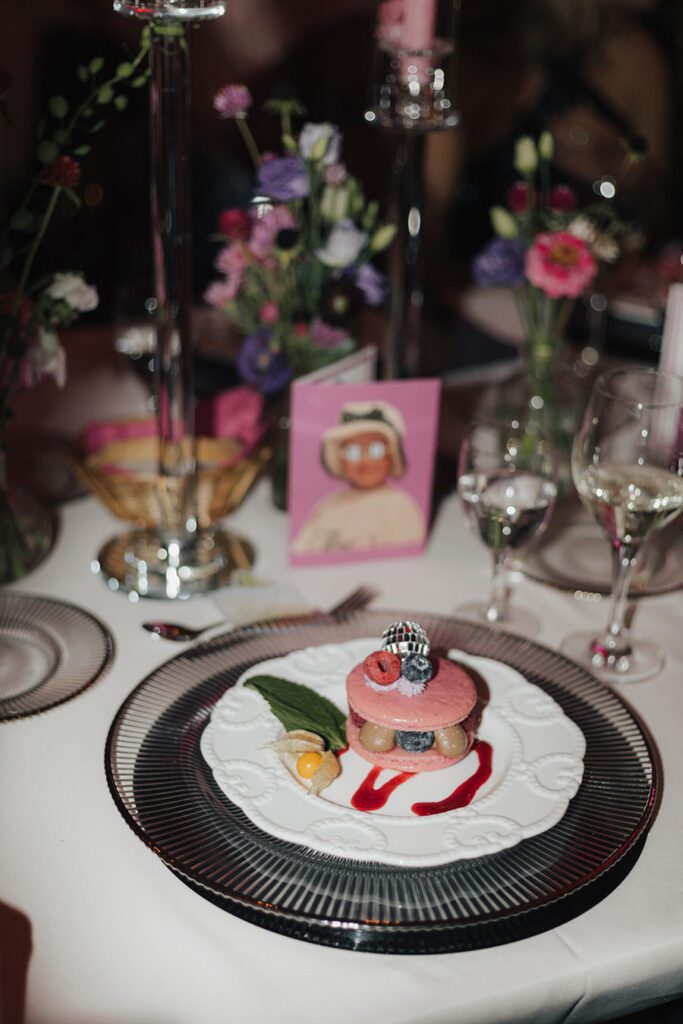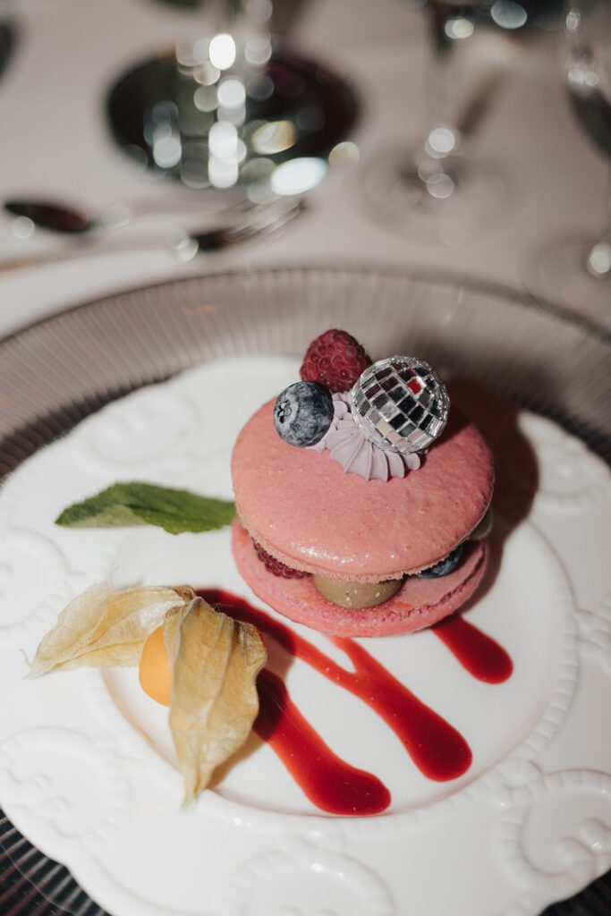 Das kreative Konzept wurde auch im Catering konsequent weitergeführt. Besonders beim Dessert zeigte sich die Liebe zum Detail: pinkfarbene Macarons, dekoriert mit kleinen Discokugeln, griffen das Disco-Thema auf spielerische Weise auf.