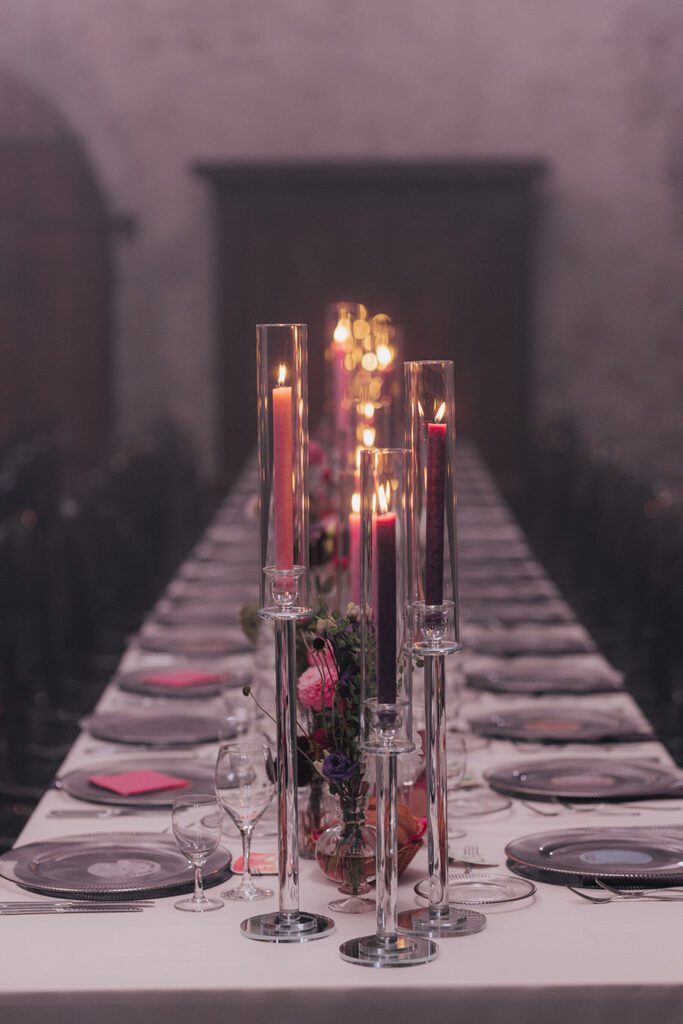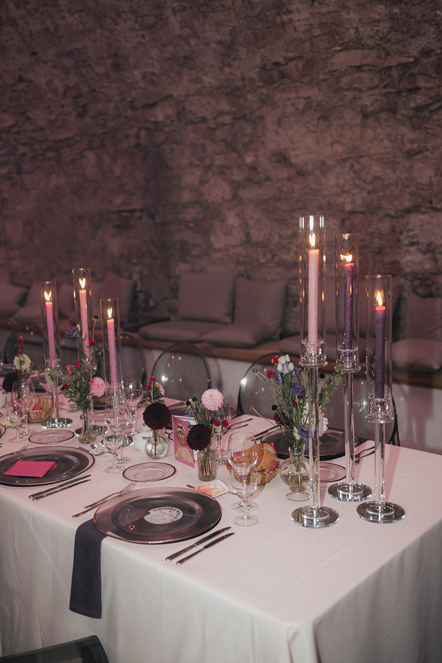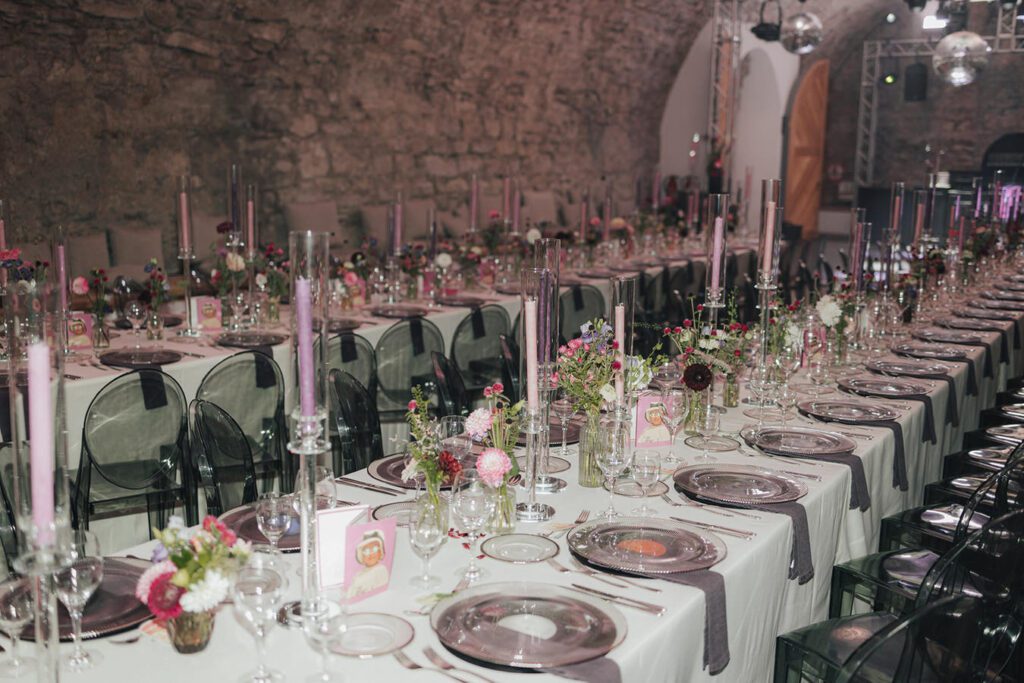 Die Tischgestaltung lebte von einer ausdrucksstarken und zugleich eleganten Farbpalette: Pink, Aubergine, Schwarz und Silber. Diese Kombination erzeugte eine moderne, leicht extravagante Atmosphäre, die perfekt zum Disco-Design passte.